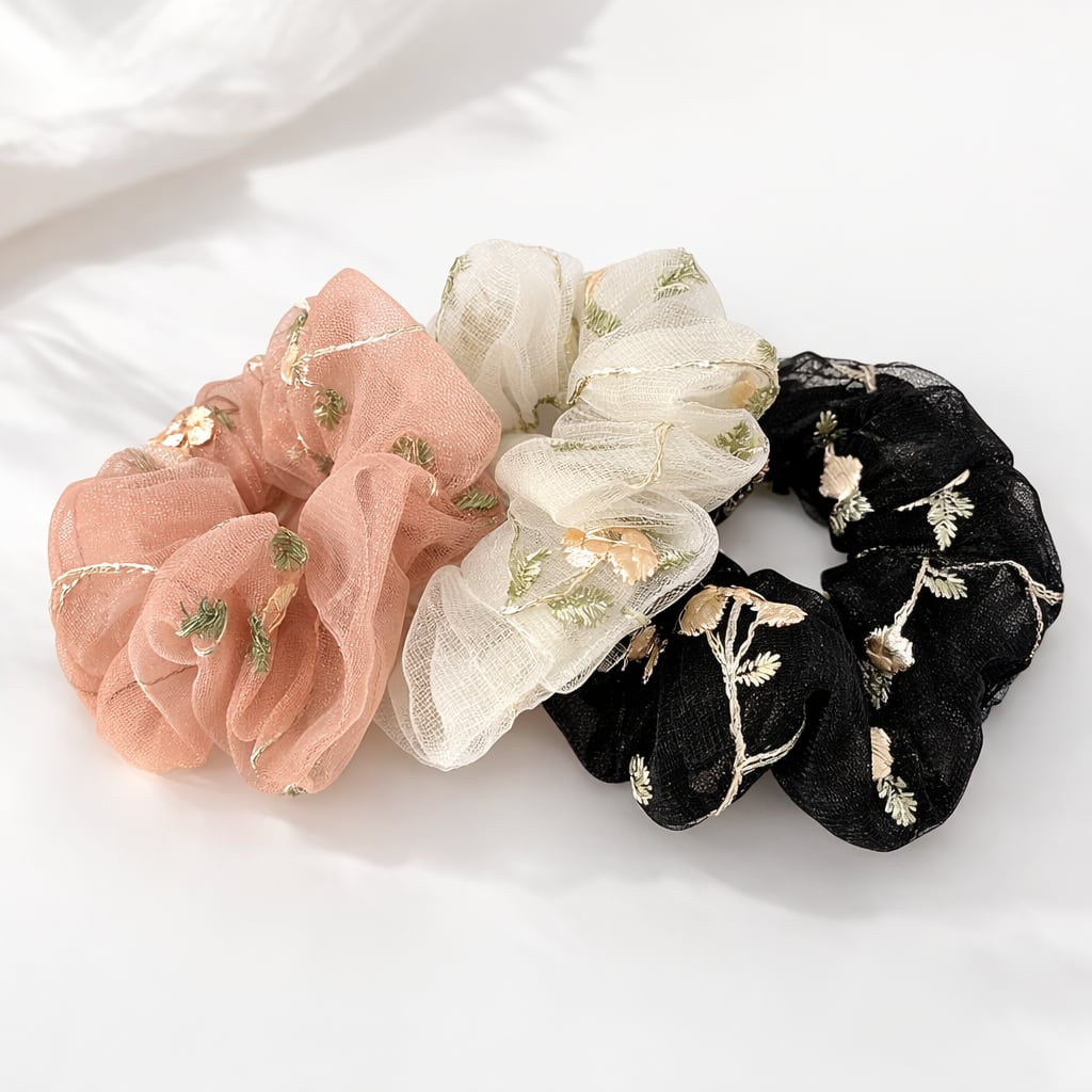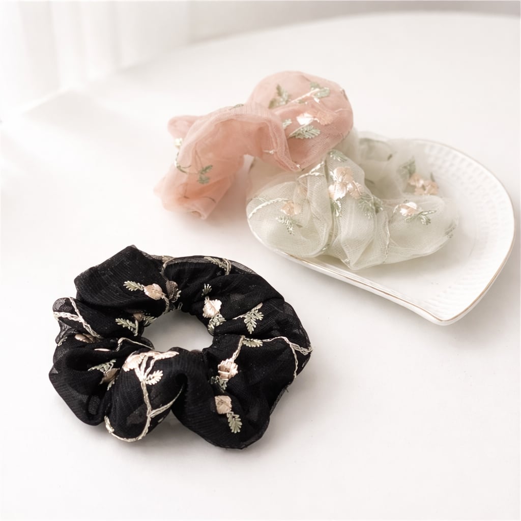 シュシュ/ヘアゴム/シフォン/花柄/刺繍/ブラック